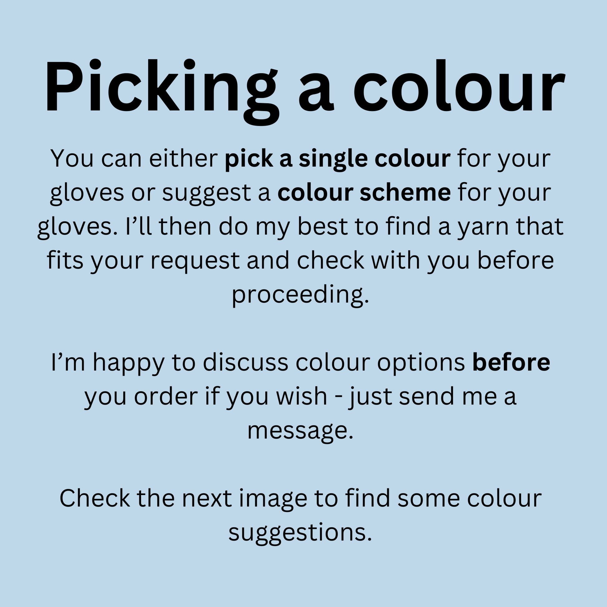 - Colours: Choose the colour options that best match your vision. The number of colours is up to you! I will do my best to incorporate your vision.