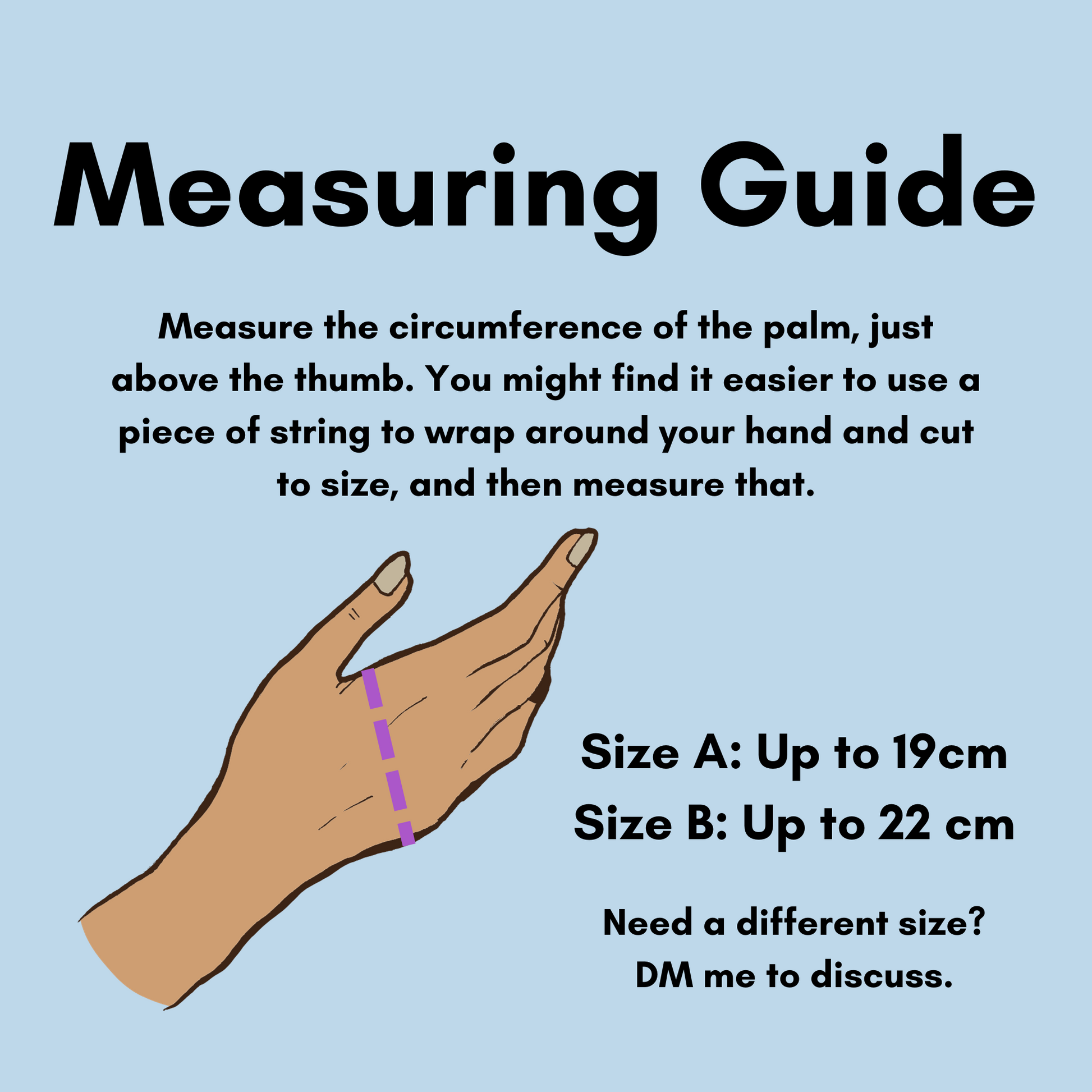 To determine your ideal size, simply measure the circumference of your palm just above the thumb. See photos for more details.