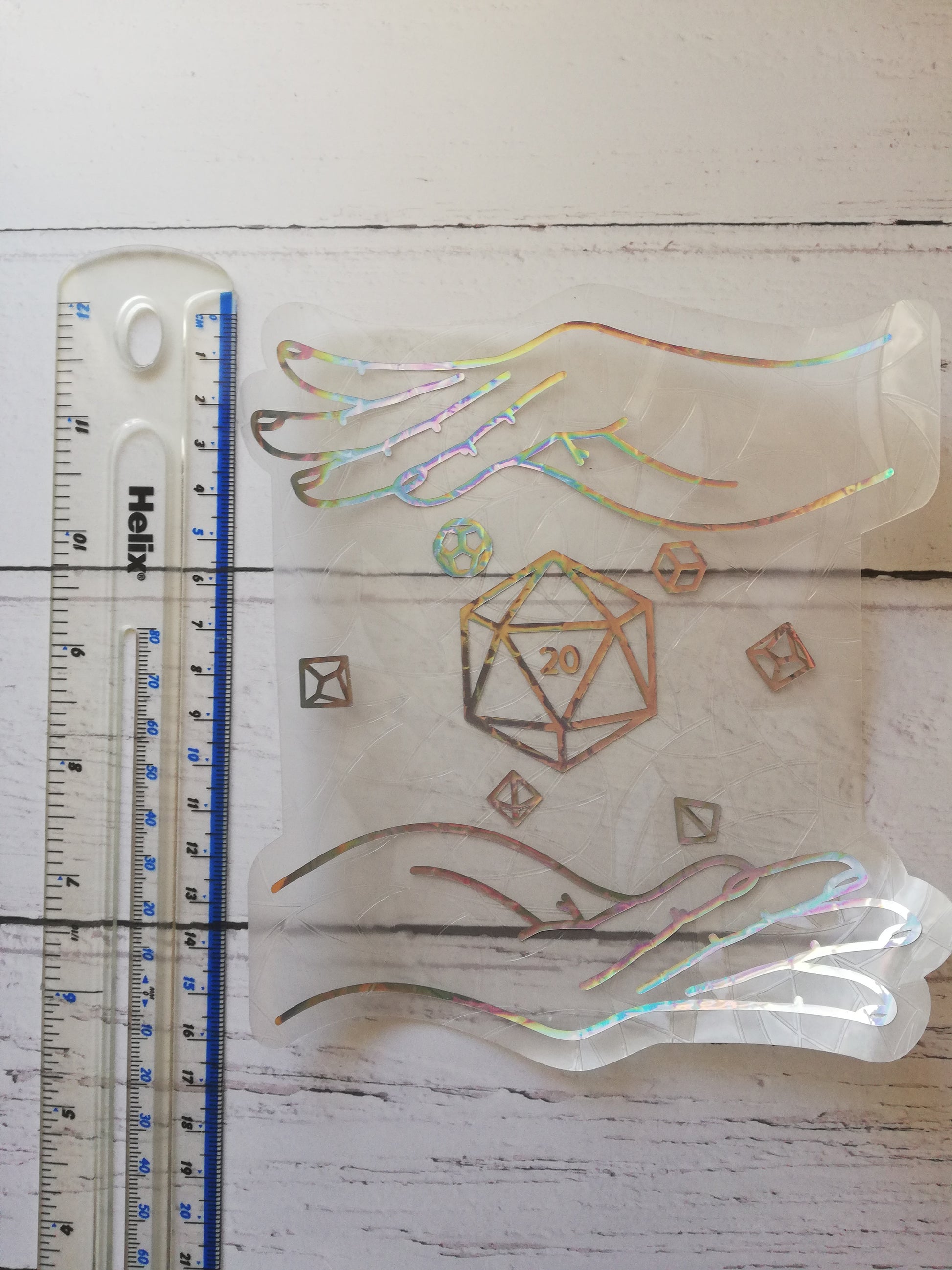 This Magical Dice Hands Suncatcher Sticker measures approximately 16.5cm tall x 15cm wide.