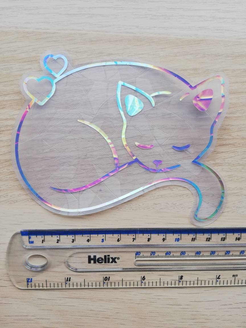 This Sleeping Cat Suncatcher Sticker measures approximately 13cm tall x 13.5cm wide. To apply: